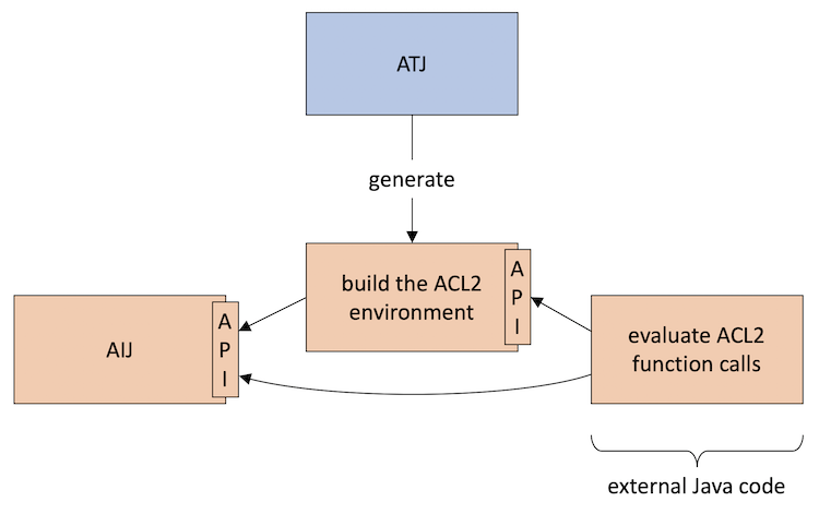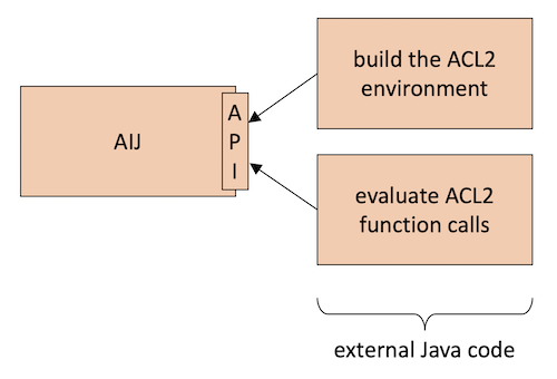 and a Java representation of the ACL2 environment, consisting of function definitions and package definitions. AIJ also includes a Java implementation of the ACL2 primitive functions, and an ACL2 evaluator written in Java.