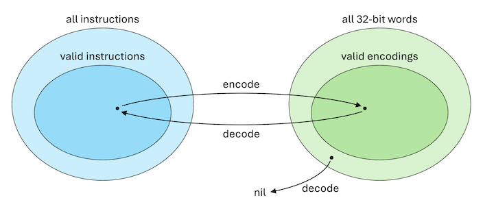 From decodex-of-encode we also know that if we start with a valid instruction in the darker blue oval, and we encode obtaining a valid encoding in the darker gree oval, then if we apply decode or decodex (they are equal) we go back to the initial valid instruction. So encode is in fact injective, as explicated in encode-injective, and the darker blue and darker green ovals are in bijective correspondence, with encode and decode (or decodex) as the bijections between them.
