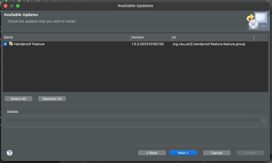 - Inside of Eclipse: go to Help | Check for Updates. This will take some time to download some information about updates before showing a list of available updates. After some time, a window should pop up that looks like the following: