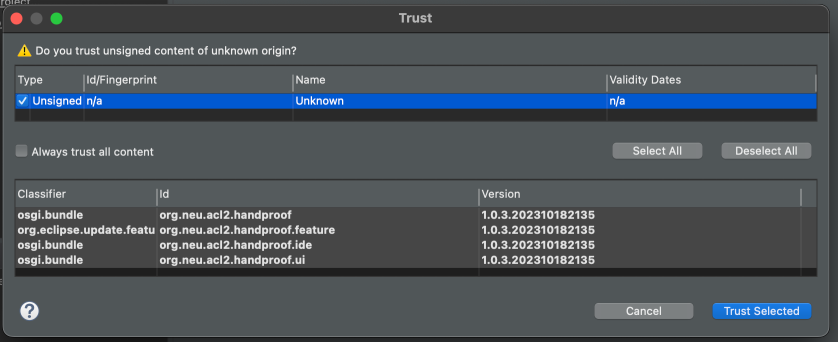 - After some time, a window may pop up asking if you want to trust unsigned content. Check the checkbox to the left of Unsigned in that window and then click Trust Selected as shown below.